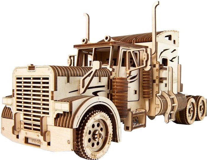 | Информация | Большой и мощный, тягач оборудован работающим шестицилиндровым R6 двигателем, который приводится в движение резиномотором. На одном заводе модель может проделать до пяти метров пути. Коробка передач переключает грузовик в два режима движения (вперед, назад) и режим холостого хода. Амортизированные передние колеса поворачиваются, задавая направление движение автомобиля. Тщательно продуманный и максимально детализированный дизайн Тягача делает модель еще более интересной. Дизайнеры оборудовали машину двумя большими трубами и двумя парами зеркал для лучшего обзора дороги, а также механизмом для реалистичной авто-сцепки с прицепом. Как и в настоящем тягаче, где дверь кабины находится на достаточно большом расстоянии от земли, в Тягаче Ugears предусмотрена лестница для более удобного доступа в кабину. На задней стенке кабины закреплена канистра и лопатка, а внутри для усталого водителя есть спальное место с телевизором. |