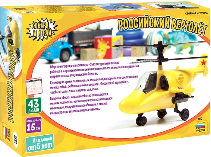 | Информация | Сборные игрушки от компании «Звезда» увлекут вашего ребёнка в мир военной техники и познакомят его с самыми интересными современными защитниками Родины.С помощью ярких пластиковых элементов, которые легко соединяются между собой, ребёнок сможет собрать «Российский вертолёт», чтобы играть с ним на улице или дома.Во время сборки модели особенно развиваются мелкая моторика, логическоеи пространственное мышление, творческие способности, а также концентрация внимания и усидчивости.Родителям всегда хочется, чтобы дети разделяли с ними интересы и увлечения, но зачастую порог вхождения в моделизм слишком высок для юного поколения. Выход найден – встречайте абсолютно новую линейку детских моделей «Собери и играй!»Все модели этой серии вы соберёте без инструментов и клея, не нужны даже кусачки. Литниковая система особой конструкции позволяет отламывать детали без образования «заусенца» и риска их повредить. |