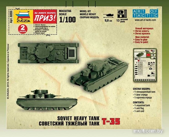 | Информация | Тяжелый танк Т-35, машина, которая наводила ужас на немецких захватчиков,из-за огромных размеров и нескончаемого обстрела врага из пяти башен. Модель идеально собирается и готова пополнить коллекции моделистов и игроков. Сборка осуществляется без клея. Танк, с помощью игровой карточки, легко интегрируется в игровую систему Art of Tactic и позволяет игроку расширить свои игровые возможности.Историческая справка:Тяжёлый танк Т-35 разработан в 1932 году под руководством Николая Всеволодовича Барыкова. Танк имел 5 башен и весил 50 тон. Предназначался для прорыва линии обороны противника. Для начала 30х годов, танк имел не плохое вооружение, однако во второй половине 30х он очень сильно устарел. Противопульная броня не имела шансов против снаряда противотанковой пушки. Т-35 был символом советского строя и отлично выглядел на парадах, но в бою он никак себя не показал. Большинство машин было потеряно в первые дни войны в основном из-за поломок. Один Т-35 участвовал в битве за Москву.Использование танка в Art of Tactic:В игре Т-35, являясь тяжёлым танком, стоит 33 очка и имеет защиту «0». Танк предназначен для поддержки пехоты на поле боя, борьбы с лёгкой артиллерией и бронеавтомобилями. Единственным его плюсом является его класс – немецкая пехота не способна бороться с тяжёлыми танками. Защита «0» делает танк бесполезным для танковых дуэлей и прорыва. |