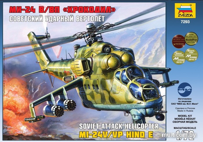 | Информация | Производство нового варианта боевого вертолета Ми-24В началось в 1976. От ранней модификации «В» отличался принципиально новым противотанковым комплексом "Штурм-В" с системой наведения "Радуга-Ш", способным поражать цель с высочайшей вероятностью - более 92%. Иными словами, из 10 выпущенных ракет бронеобъекты противника поражали 9 или даже все 10! Ми-24В существенно превосходил по боевой эффективности своего американского соперника АН-1S Super Cobra.С 1976 г. по 1986 г. было выпущено около тысячи Ми-24В. В составе ограниченного контингента советских войск эти вертолеты воевали в Афганистане, поставлялись на экспорт во многие страны мира. В настоящее время они составляют основу армейской авиации России.Модель создавалась при помощи специалистов МВЗ им. Миля и абсолютно точно соответствует геометрии прототипа. Впервые в мире на этой модели выполненно выпуклое стекло. |