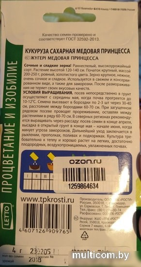 | Информация | Сочные и сладкие зерна! Раннеспелый, высокоурожайный сорт. Растение высотой 120-140 см. Початок крупный, массой 200-250 г, ровный, золотистого цвета. Зерно крупное, нежное, очень сочное и сладкое. Используется в свежем и консервированном виде, а также для заморозки. После размораживания не теряет своих вкусовых качеств. Условия выращивания. посев непосредственно в грунт осуществляют с середины мая, когда почва прогреется до 10-12°С. Семена высевают в бороздки по 2-3 шт через 30-40 см, расстояние между бороздами 60-70 см. При загущенном рядовом посеве проводят прореживание, оставляя между растениями в ряду 60-70 см. В северных регионах рекомендуется выращивать через рассаду: посев семян в конце апреля, высадка в открытый грунт в конце мая – начале июня, когда минует угроза заморозков. Дальнейший уход заключается в рыхлении, прополках, поливах и подкормках. Культура требовательна к теплу и хорошо растет на легких, достаточно плодородных, воздухопроницаемых, увлажненных почвах. |