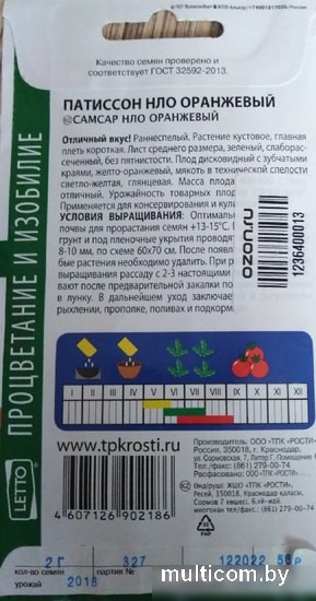 | Информация | Раннеспелый. Растение кустовое, главная плеть короткая. Лист среднего размера, зеленый, слаборассеченный, без пятнистости. Плод дисковидный с зубчатыми краями, желто-оранжевый, мякоть в технической спелости светло-желтая, глянцевая. Масса плода 400-500 г. Урожайность товарных плодов 2,9-5,5 кг/м2. Применяется для консервирования и кулинарии. Условия выращивания.Оптимальная температура почвы для прорастания семян +13-15°C. Посев в открытый грунт и под пленочные укрытия проводят в мае на глубину 8-10 мм, по схеме 60х70 см. После появления всходов сла- бые растения необходимо удалить. При рассадном способе выращивания рассаду с 2-3 настоящими листьями высажи- вают после предварительной закалки по одному растению в лунку. В дальнейшем уход заключается в регулярном рыхлении, прополке, поливах и подкормках. |