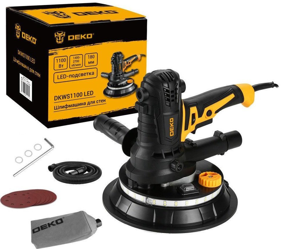 | Информация | Шлифмашина для стен DEKO DKWS1100 LED предназначена для шлифовки отделочного слоя гипсокартона, потолков и внутренней кладки, а также для удаления остатка обоев, краски, покрытий, клея и старой штукатурки. Также можно использовать инструмент для шлифовки полов. Длинный сетевой кабель (3,5 м) обеспечит свободное перемещения по рабочей площадке.  |