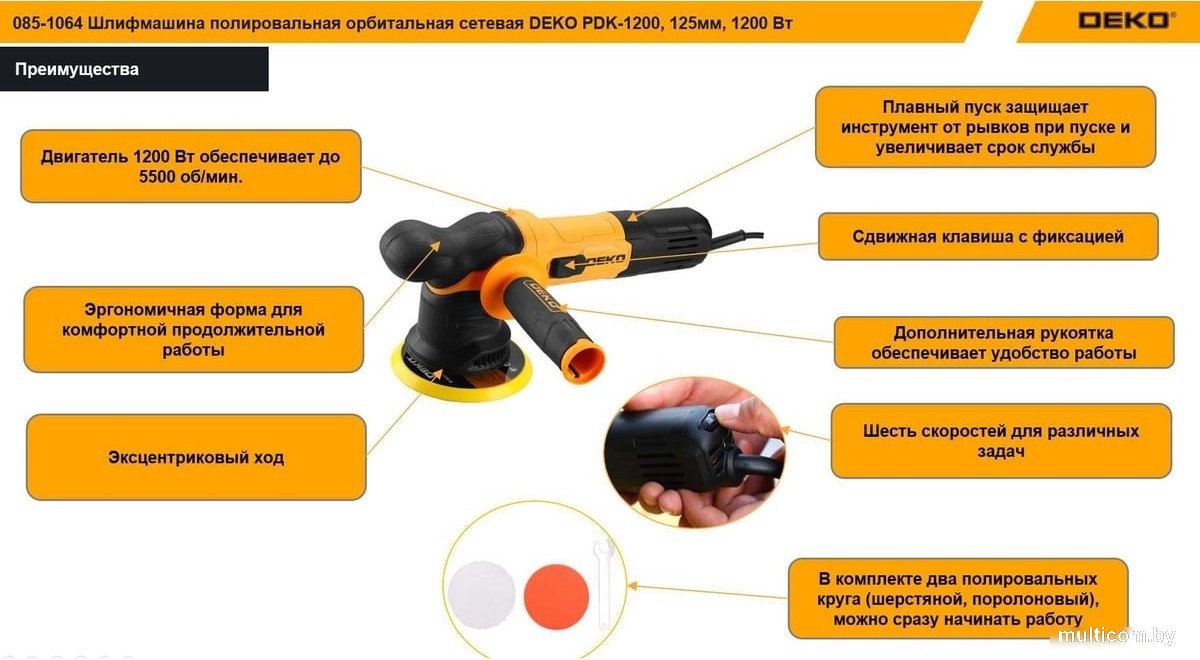 | Информация | - Эксцентриковая шлифмашина Deko PDK-1200 идеально подходит для полирования и шлифования различных покрытий, включая лакокрасочные и полимерные материалы. Эта мощная сетевая модель обеспечит вам высокое качество работы и отличные результаты. - Удобство в использовании достигается благодаря дополнительной рукоятке, которая позволяет надежно удерживать инструмент и контролировать процесс шлифования. Это особенно важно при работе с большими поверхностями или в труднодоступных местах. - Крепление оснастки на липучку обеспечивает быструю и легкую замену абразивных дисков, что значительно экономит время и усилия. Вы сможете легко адаптировать шлифмашину под различные задачи, будь то шлифовка, полировка или удаление старого покрытия. - Deko PDK-1200 — это надежный инструмент, который станет незаменимым помощником как для профессионалов, так и для любителей. С его помощью вы сможете добиться идеальной поверхности и качественного финиша в своих проектах.  |