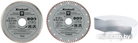 Комплект поставкиЗащитный кожухДополнительный закрытый защитный кожухДополнительная рукояткаКлюч для фланцевой гайкиАлмазный сегментированный диск для резки камня и бетона - 2 штРуководство по эксплуатации