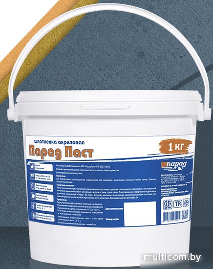 | Информация | Шпатлевка белая В П акриловая 1 ПС "Парад Паст" СТБ 1263 — 2001 готовая к применению для внутренних отделочных работ колер - белый ПАРАД ПАСТ - готовая к применению акриловая белая шпатлевка для сплошного выравнивания поверхностей под нанесение декоративных покрытий, оклейку обоями, окраску и другие виды финишной отделки внутри помещений. Колер белый. |