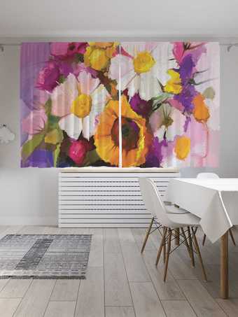 | Информация | Украшенные разноцветными принтами фотошторы на шторной ленте будут стильно смотреться на кухне любой площади и дизайна. Они изготовлены из прочной и шелковистой на ощупь ткани сатена. При плотности 175 г/м2 этот материал практически не мнется, без проблем выдерживает многократные стирки и не усаживается. Изделие состоит из двух полотен размером 145х180 см, которые уже подшиты шторной лентой и комплектуются 50 карнизными крючками. Эти оригинальные по расцветке короткие шторы на кухню пропускают около 30% света, поэтому отлично выглядят днем, и не слишком прозрачны в вечернее время при включенном освещении внутри дома. При заказе следует учитывать, что допуск размеров полотен составляет не более 5 см, а яркость рисунка на шторах может несколько отличаться от изображения на экране. |