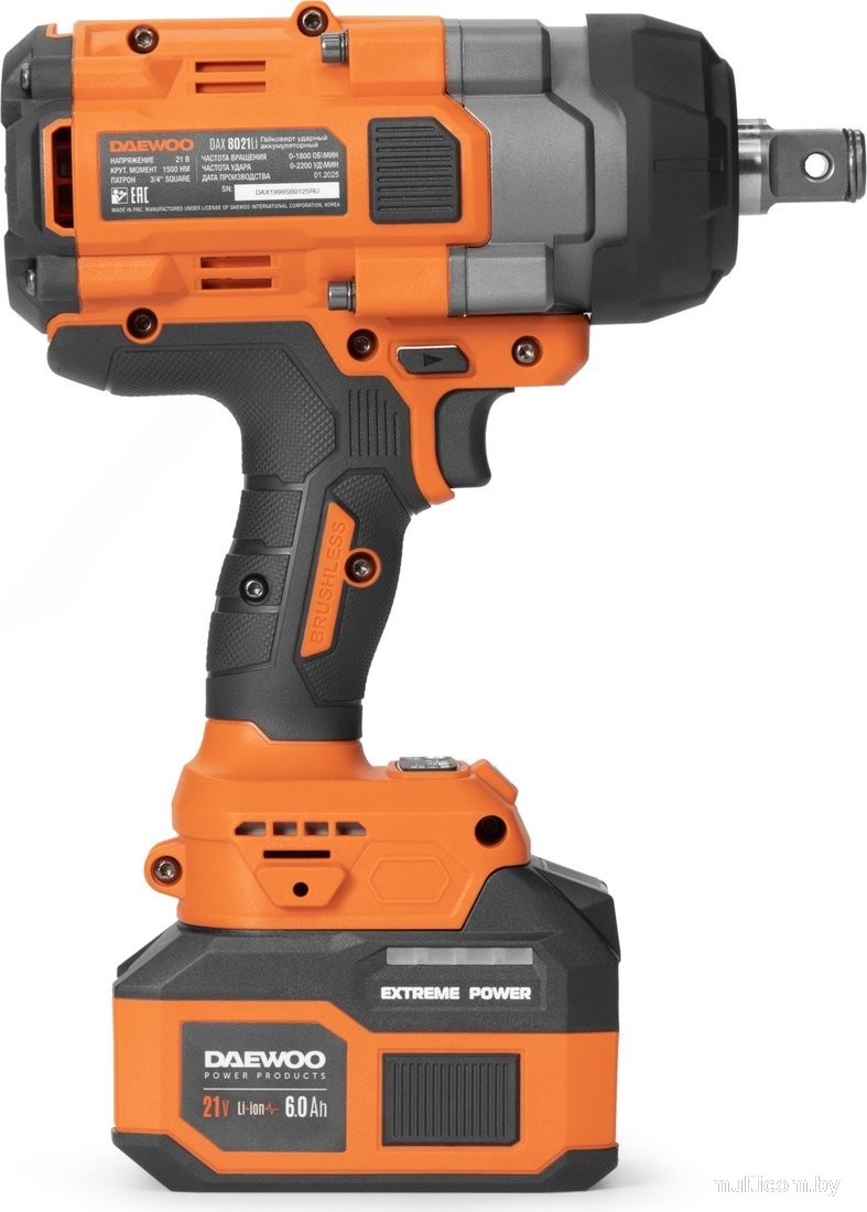 | Информация | - 21В Li-ion единая платформа Винтоверт совместим со всеми аккумуляторными батареями DAEWOO линейки 21В. - Бесщеточный электродвигатель Обладает повышенной мощностью, развивает высокие обороты, обладает долгим сроком службы и все это при меньшем потреблении энергии, по сравнению с щеточными аналогами. - Крутящий момент 1500 Нм Максимальный крутящий момент 1500 Нм позволяет гайковерту справляться с различными, даже самыми сложными задачами. - Квадратный патрон 3/4” Квадрат 3/4” с проточкой обеспечивает надежное крепление ударных головок. - Электронная панель управления Панель управления в нижней части корпуса позволяет выбрать предустановленные настройки крутящего момента и предустановленные автоматические режимы работы. - Настройка крутящего момента Гайковерт оснащен 4 предустановленными режимами крутящего момента: «1» - 700 Нм «2» - 900 Нм «3» - 1100 Нм «4» - 1500 Нм Переключение осуществляется кнопкой «Nm» на панели управления. - Интеллектуальные режимы работы Гайковерт обладает 4 интеллектуальными режимами работы: «1 AUTO» Автоматическая остановка. При закручивании - остановка при появлении нагрузки. При откручивании – остановка при прекращении нагрузки. «2 AUTO» Автоматическая остановка с докручиванием. При закручивании - остановка через 0,5 с при появлении нагрузки. При откручивании – остановка через 0,2 с при прекращении нагрузки. «3 AUTO» Автоматическая снижение скорости. При закручивании - остановка через 1 с при появлении нагрузки. При откручивании – снижение скорости при снижении нагрузки. «4 AUTO» Полная скорость вращения при любом нажатии на кнопку. - Полный комплект Аккумулятор 21В/ 6.0Ач и зарядное устройство 2.5 А уже в комплекте. Вы сразу можете приступить к работе. Для удобства хранения и транспортировки весь комплект легко размещается в пластиковом кейсе. - LED подсветка Позволяет эффективно использовать гайковерт в условиях ограниченного освещения. - Пластиковый кейс Кейс выполнен из прочного пластика в виде систейнера с замками, обеспечивающими быструю и надежную установку кейсов один над другим, что облегчает транспортировку и способствует экономии пространства для хранения. Отдельный отсек на корпусе кейса позволяет удобно переносить необходимую оснастку. |