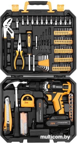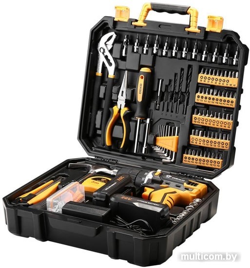 | Комплектация | Дрель-шуруповерт 1 шт зарядное устройство2 шт аккумулятор11 шт 1/4" биты: SL4,5.5, PH1,2, PZ1,2, H3,4, T10,15,20,1 шт 1/4" универсальный шарнир,1 шт магнитный держатель бит 60мм,1 шт 1/4" x3 удлинитель,1 шт переставной ключ,1 шт 6" плоскогубцы,1 шт держатель бит 6,35 мм,Шестигранные ключи: 1,5-6 мм,5 шт сверла: 2,3,4,5,6мм,50 шт 25L биты: SL3,3,4,5,6, PH0,0,1,1,2,2,3,3, PZ0,0,1,1,2,2,3,3, H1,5, 1,5,2,2,3,4,4,5,5,5,5,6,6, T10,15,20,25,27,30,35, S0,0,1,1,2,2,3, 3, AD, AD, 9 шт. 1/4" розетки: 5,6,7,8,9,10,11,12,13 мм,1 шт измерительная лента 3м,1 шт молоток,1 шт строительный нож 18мм,103 шт крепежКейс |