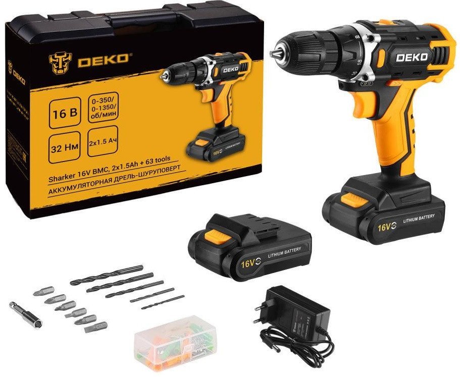 | Информация | - Аккумуляторная дрель-шуруповерт DEKO Sharker 16V BMC с двумя аккумуляторами по 1.5Ah и набором из 63 инструментов идеально подходит для строительных и слесарно-монтажных работ. - С её помощью вы сможете быстро высверливать отверстия нужного диаметра как в древесине, так и в металле, а также легко вкручивать и извлекать крепежные элементы. - Не упустите возможность сделать свои проекты более эффективными с этой универсальной дрелью-шуруповертом! |