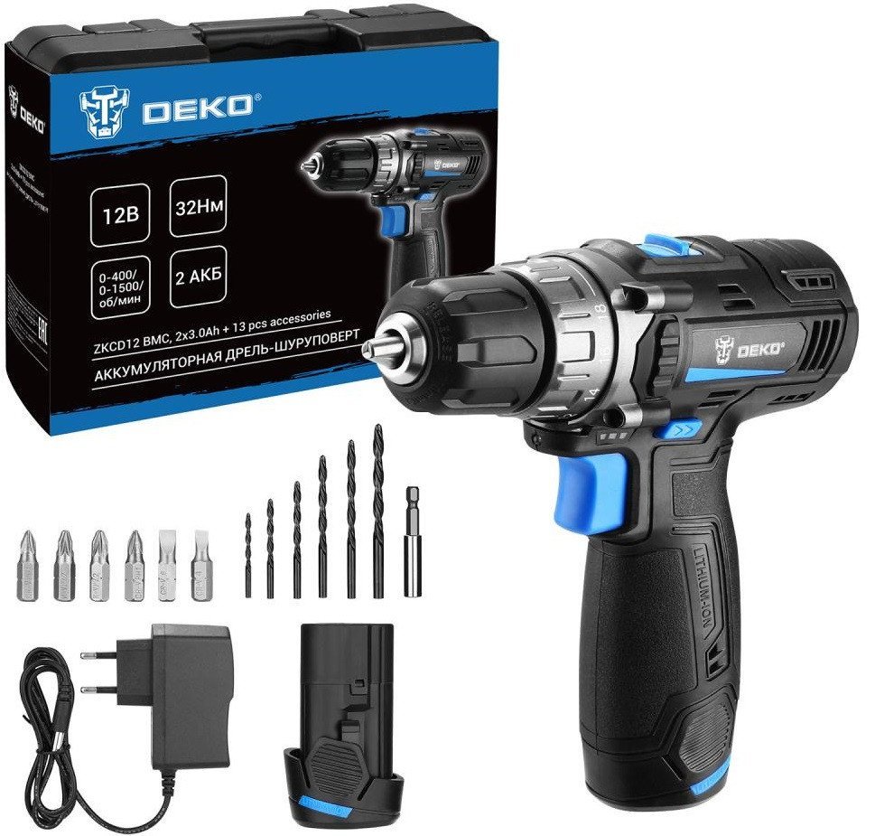 | Комплектация | - Дрель-шуруповерт - 1 шт. - Аккумулятор 3,0 Ач - 2 шт. - Зарядное устройство - 1 шт. - Сверла: 2, 2.5, 3, 4, 5, 6 мм - 6 шт. - Биты: SL4, SL6, PH1, PH2, PZ1, PZ2 - 6 шт. - Удлинитель для бит - 1 шт. - Инструкция - Кейс |