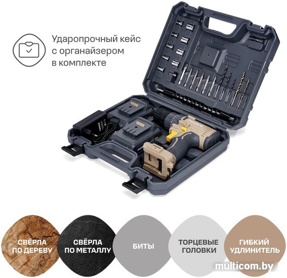 | Комплектация | - дрель-шуруповерт, - аккумулятор (2 шт), - зарядное устройство, - биты (7 шт), - сверла (6 шт), - торцевые головки (9 шт), - переходник для головок, - угловой удлинитель, - инструкция. |