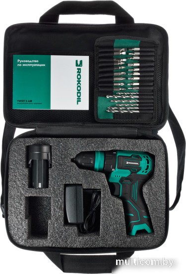 | Комплектация | 1. Аккумуляторная дрель-шуруповерт Rokodil Twist 2 Air 2. Чехол для оснастки 3. Биты — 18 шт 4. Сверла — 6 шт 5. Руководство по эксплуатации 6. Транспортировочная коробка 7. Сумка для транспортировки и хранения 8. Li-ion аккумулятор RBA-128V-2A 1 шт. 9. Зарядное устройство RCA-12V-1.5A |