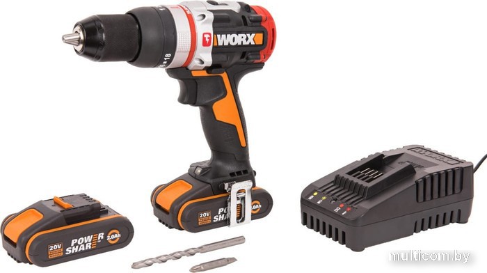 | Комплектация | Дрель-шуруповерт WORX WX354 2 аккумулятора Li-Ion емкостью 2 А*ч Зарядное устройство WORX 2А Двусторонняя бита Крюк Зажим для сверла Кейс |