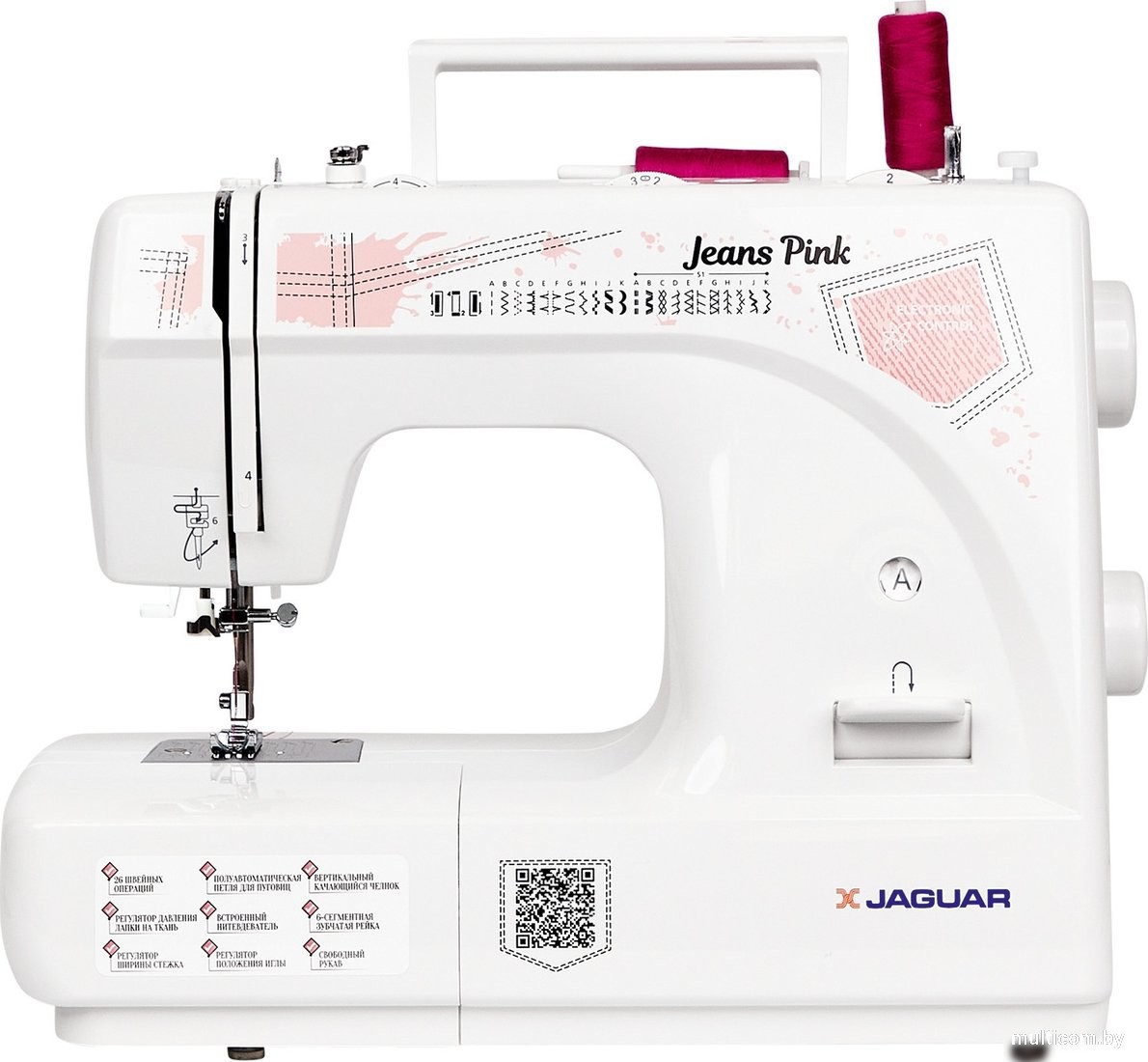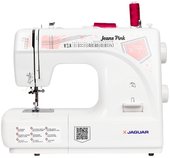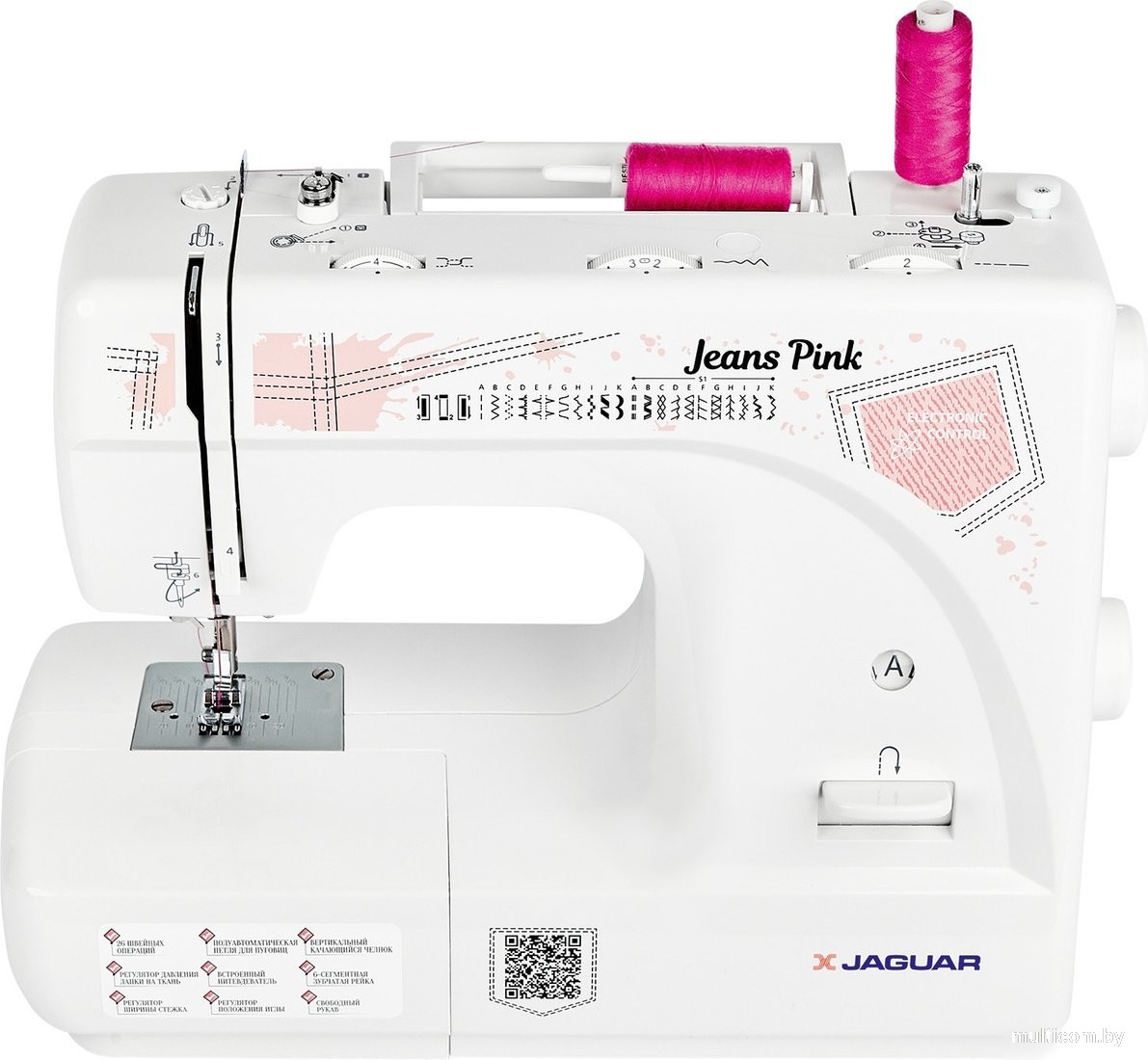 | Информация | - Jaguar Jeans Pink — это электромеханическая швейная машина с классическим вертикальным челноком и встроенным нитевдевателем.  - Она предлагает 26 швейных операций, включая полуавтоматическую петлю для пуговицы, декоративные и оверлочные строчки, а также строчки для трикотажных и эластичных тканей. Для работы с плотными материалами предусмотрен регулятор давления лапки на ткань. - Удобный переключатель выбора строчек позволяет легко выбирать нужный режим, а символ выбранной строчки отображается в смотровом окне на передней панели. Вы сможете настраивать длину и ширину стежка, а также менять положение иглы. - В отсеке съёмного столика хранится вся комплектация с дополнительными лапками. Для шитья мелких и круговых изделий предусмотрен свободный рукав, который открывается при отсоединении столика. - Двойная игла, приобретаемая отдельно, позволяет выполнять аккуратную декоративную отделку швов. - Jaguar Jeans Pink универсальна и подходит для работы с широким диапазоном тканей — от лёгких до тяжёлых.  |