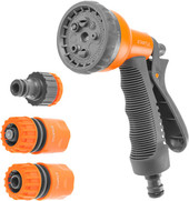 | Информация | Набор: быстросъемная муфта 1/2"(5/8"), быстросъемная муфта автостоп 1/2"(5/8"), адаптер внешний 1/2" & 3/4".8 видов струи с регулировкой напора:1. center - центр, 2. mist - водяная пыль, 3. shower - душ, 4. angle - под углом, 5. full - сильная струя, 6. soaker - прямая струя, 7. cone - конусное распыление, 8. flat - плоская струя. |