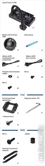 | Комплектация | 1x Liquid Freezer III 280 A-RGB 1x Модуль вентилятора VRM 1x MX-6 (0.8 g) 1x Кабель ШИМ (индивидуальное управление) 1x Кабель ШИМ (все в одном) 8x Плоские металлические шайбы 16x Винты Intel 1x Контактная рамка процессора 1x Ведущая деталь T20 4x Упорные винты AMD 4x Винты 4x Шайбы 1x Комплект монтажных модулей |