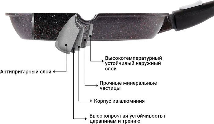 | Информация | Безопасность и экологичность сковород обеспечивает современное антипригарное покрытие Platinum. Компания FISSMAN - первый в мире производитель, который начал его использование. Сочетание алюминия с инновационным покрытием сделало изделия REBUSTO ярчайшей серией на мировом посудном рынке. Это заслуга профессиональных технологов и дизайнеров бренда, вкладывающих в создание посуды знания, опыт и собственное видение. • Platinum - профессиональное покрытие, признанное ведущими шеф-поварами. • За счет того, что поверхность шероховатая, она идеально подходит для приготовления блюд с хрустящей корочкой. • Благодаря съемной ручке сковороды REBUSTO можно использовать для запекания в духовке. Изделия удобно хранить в разобранном виде. • Рифленое дно позволяет готовить с минимальным количеством масла. Продукт практически не контактирует с раскалённым дном, блюда получаются очень сочным. • Носики для слива позволяют сливать лишнюю жидкость и масло. • Сковороды, имеющие оригинальное покрытие с мерцающими частицами, станут достойным украшением кухни. Покрытие не темнеет со временем. |