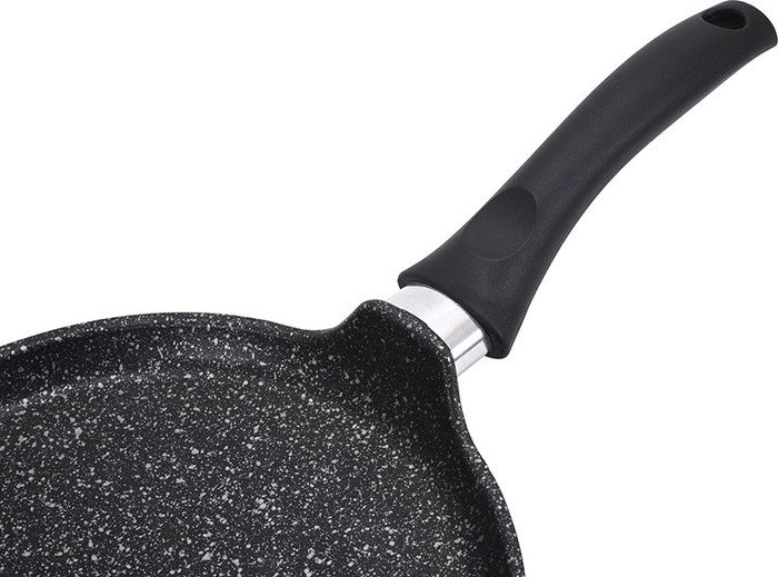 | Информация | Особенности сковороды Kukmara: Значительная толщина стенок и дна исключает деформацию корпуса сковороды, гарантирует ее долговечность, обеспечивает необходимую прочность покрытия. Высокопрочное антипригарное покрытие на водной основе, усиленное сверхпрочными минеральными частицами. Экологически безопасное антипригарное покрытие без содержания PFOA. Идеальное распределение тепла по всей поверхности посуды, длительное сохранение тепла. Возможность использования минимального количества жира. Удобная ненагревающаяся ручка из бакелита. Антипригарное покрытие наносится методом напыления, который гарантирует исключительную стойкость покрытия при эксплуатации. Мелкие царапины и небольшие потертости на поверхности сковороды не влияют на свойства антипригарного покрытия и долговечность посуды. Продукты не пригорают и сохраняют свой вкус. Высокая теплопроводность и эргономичность. Легкость мытья. Подходит для всех типов плит, кроме индукционных. Стенка сковороды состоит из 6 слоев: Внутреннее покрытие «мрамор». Высокопрочное антипригарное покрытие на водной основе, усиленное сверхпрочными минеральными частицами. Усиленный грунтовой слой. Слой с шероховатой поверхностью для лучшего сцепления покрытия. Литой алюминиевый корпус толщиной до 6 мм. Наружное антипригарное покрытие «мрамор». |
