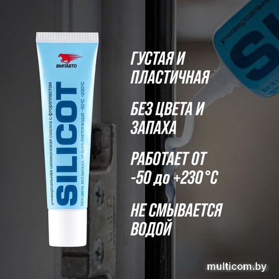 | Информация | Работает в широком диапазоне температур от - 50 до +230°C. Шоу-бокс. Silicot универсальная силиконовая смазка. Свойства: устраняет скрип дверей и петель, препятствует коррозии, обмерзанию, облегчает монтаж пластиковых труб, уменьшает трение поверхностей, долговечна, обладает водоотталкивающими свойствами, высокой термостойкостью (от минус 50 до плюс 230°C), не требует распыления, не смывается и не стекает, не испаряется, нетоксична. |