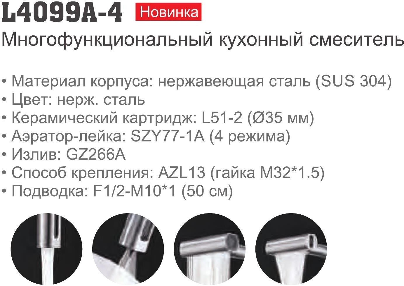 | Информация | Особенности:_x000D_ _x000D_ лейка не выдвигается._x000D_ в базовом положение лейка поворачивается на 360 градусов._x000D_ у лейки четыре грани с аэраторами._x000D_ 4 режима, струи у лейки._x000D_ переключение режимов поворотом лейки на 90 и нажатием кнопки на лейки._x000D_ режим 1 (базовый) (обычная струя из торца лейки)._x000D_ режим 2 (широкая и мощная струя из торца лейки, вкл. нажатием кнопки на лейке)._x000D_ режим 3 (водопад, из боковой грани лейки, мощный, вкл. поворотом лейки на 90 градусов)._x000D_ режим 4 (водопад, из боковой грани лейки, мягкий дождь, вкл. поворотом лейки на 90 градусов). |