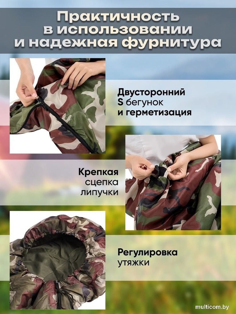 Информация | Уютный и просторный спальный мешок туристический с капюшоном камуфляжный для сна водоотталкивающий - отличный выбор для активного отдыха на природе, в походе, охоте или рыбалке. Спальник туристический станет незаменимым помощником в прохладное время года, сохраняя Вас всегда в тепле и комфорте, благодаря набору качественных материалов. Благодаря легкому и компактному корпусу, мешок удобно транспортировать в рюкзаке и не он занимает много места. Большой размер мешка позволяет удобно разместиться внутри, как взрослым, так и детям. Материалы и утеплитель использованные для изготовления этого мешка являются долговечными и устойчивыми к воздействию природных факторов, что позволяет использовать его в любых погодных условиях. Он легко стирается и сохраняет свои свойства даже после многократных стирок. Таким образом, летний спальный мешок с подголовником является незаменимым аксессуаром для всех любителей активного отдыха на природе. Этот теплый спальный мешок для сна - одеяло с подголовником можно использовать как подстилку, а утепленный капюшон придаст дополнительное тепло в холодные ночи на открытом воздухе. Спальник летний влагостойкий трансформируется в одеяло и может быть удобен в дороге во время путешествий, сохраняя тепло при температуре от +5 до +25 градусов, что позволяет ощутить уют и комфорт в любых условиях. спальный мешок военный также имеет уникальные защитные свойства, которые обеспечивают защиту от ветра, влаги и мелких насекомых. Спальный мешок непромокаемый можно использовать на летнем привале или в летний период. Спальник для похода и туризма легкий и удобный, не занимает много места, что делает его компактным. В комплект входит камуфляжный чехол, который удобен для хранения и переноски мешка. Размер мешка составляет 210?75 см и он подойдет как для мужчин, так и для женщин. Набор предметов для туризма и отдыха на природе, охоты и рыболовные товары не будут полными без этого камуфляжного мешка. Заказывайте туристическое снаряжение наслаждайтесь комфортом/ |