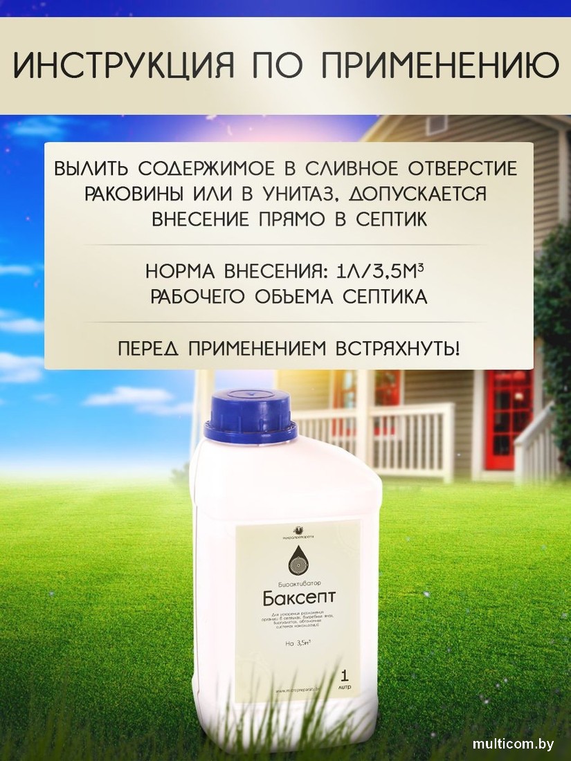 | Информация | - Биоактиватор БакСепт - эффективное средство для септиков и уличного туалета. Этот продукт содержит бактерии, которые помогают поддерживать чистоту и устранять неприятные запахи. Средство идеально подходит для использования в выгребных ямах и дачных туалетах. Микроорганизмы в составе начинают работать сразу после применения, ускоряя разложение органических отходов. Окончательный результат будет виден через 1-3 недели. - Бактерии для септиков и выгребных ям обеспечивают поддержание экологического баланса и снижают частоту чистки. Продукт справляется с неприятными запахами, оказывая долговременное действие. Средство также способствует уменьшению объема твердых отходов, предотвращая засорение систем. - Для уличного туалета это средство незаменимо благодаря своим активным компонентам. Используйте биоактиватор для септика регулярно, чтобы добиться наилучших результатов. Его компоненты эффективно перерабатывают органические вещества, уменьшая количество осадка. Благодаря своему составу, средство безопасно для окружающей среды и не наносит вреда насаждениям. Норма внесения: 1л/3,5м3 рабочего объема септика. - Бактерии для уличного туалета разрыхляют осадок и предотвращают возникновение нежелательных накоплений. Для дачного туалета бактерии важный элемент ухода за системой очистки сточных вод. Их использование помогает предотвратить проблемы с засорами и обеспечивает безупречную работу всех компонентов системы. - Средство для дачного туалета работает быстро и эффективно при любых погодных условиях, обеспечивая долгий срок службы вашего септика или уличного туалета без необходимости частого обслуживания. Отличный вариант по уходу за выгребными ямами благодаря долговременному действию входящих в состав микроорганизмов. Сроки и условия хранения: 6 месяцев при температуре хранения от +4? до +15?;3 месяца при комнатной температуре. Средство для дачных туалетов и выгребных яма, средство для выгребных ям и туалетов, средство для дачного туалета от запаха, средство для дачных туалетов. - |