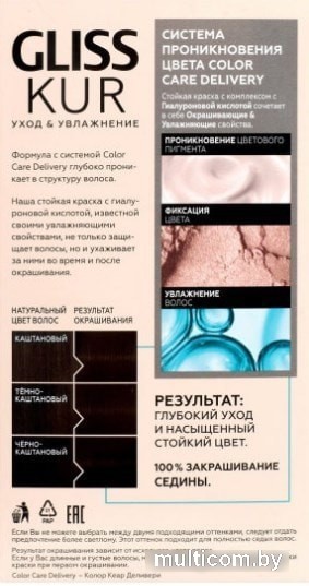 | Информация | Стойкая краска для волос Gliss Kur Уход & Увлажнение с гиалуроновой кислотой. Превосходный уход во время и после окрашивания. - Заметно улучшает качество волос - Интенсивный цвет + 100% закрашивание седины Формула c системой Color Care Delivery глубоко проникает в структуру волоса. Наша стойкая краска c гиалуроновой кислотой, известной своими увлажняющими свойствами, не только защищает волосы, но и ухаживает за ними во время и после окрашивания. Результат: глубокий уход и насыщенный стойкий цвет. |