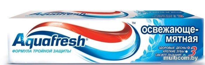 | Информация | Зубная паста AQUAFRESH Fresh&Minty Освежающе-Мятная 100 мл (1862407) образует на зубах защитный слой, снижает чувствительность нервных окончаний зуба, обеспечивает зубам долговременную защиту, нежно защищает от кариеса и зубного налета, освежает дыхание, восстанавливает естественную белизну зубов. Антибактериальная формула зубной пасты делает зубы крепкими, десны здоровыми, дыхание свежим. Восстанавливает эмаль при небольших повреждениях. Содержит фтор. Зубная паста Aquafresh это три пасты в одной с уникальным освежающе-мятным вкусом, подарит Вам ощущение тройной защиты и чистоты полости рта. Зубная паста Aquafresh "Освежающе-мятная" помогает обеспечить тройную защиту полости рта: здоровые десны, крепкие зубы, свежее дыхание. |