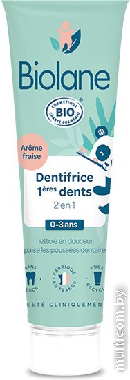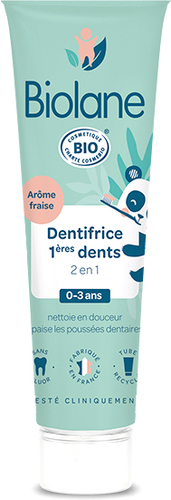 | Информация | Детская зубная паста Biolane 2-в-1 бережно очищает первые молочные зубы вашего ребенка и успокаивает десны, чувствительные к прорезыванию зубов. 98% натуральная формула без фтора, наличие экстрактов календулы, ромашки и гвоздики, известных своими успокаивающими свойствами, помогают облегчить состояние чувствительных десен ребенка во время прорезывания зубов. |