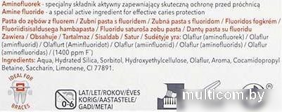 | Состав | Aqua, Hydrated silica, Sorbitol, Hydroxyethylcellulose, Olaflur, Aroma, Cocamidopropyl betaine, Saccharin, Limonene, CI 77891, Obsahuje: olaflur (aminfluorid) (1400 ppm F) |