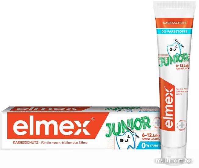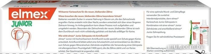 | Информация | "Elmex Юниор" детская зубная паста для детей от 6 до 12 лет укрепляет эмаль и защищает от кариеса вновь прорезавшиеся постоянные зубы. Предназначена для ежедневной гигиены полости рта детей в возрасте 6-12 лет с целью обеспечения длительной защиты от кариеса, снижения растворимости и укрепления зубной эмали. |