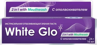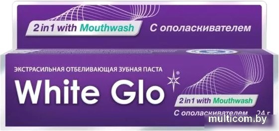| Информация | Отбеливающая паста White Glo 2 в 1 поможет вам поддерживать гигиену полости рта. Входящий в состав специальный ополаскиватель борется с бактериями и зубным налётом в труднодоступных местах, вызывающими неприятный запах. Паста обладает двойной силой отбеливания. |