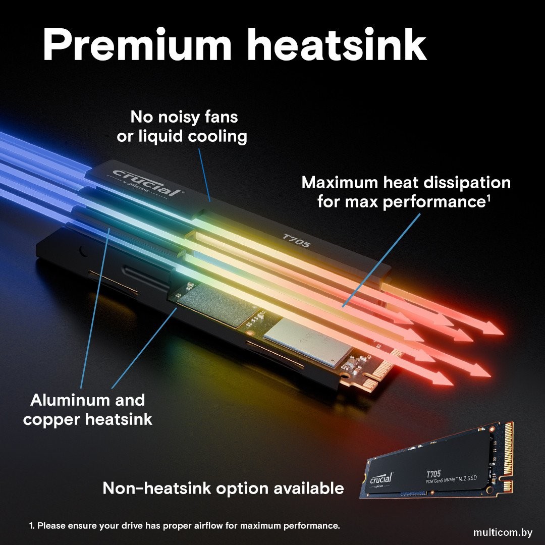 | Информация | Enhance the speed and performance of your desktop or laptop with this Crucial 4TB T705 NVMe PCIe 5.0 M.2 Internal SSD with Heatsink. Based on the PCIe 5.0 interface, this 2280 M.2 solid-state drive provides you with up to 14100 and 12600 MB/s read and write speeds, respectively, ensuring quick data transfer rates which increases loading speed while providing you with ample storage space. Micron 232L 3D TLC NAND controller and flash memory ensures your information is properly stored and recalled within a moment's notice, boosting the overall performance of your applications and even games. Experience a long-lasting lifespan with a massive 2400 TBW endurance and Mean Time Between Failure (MTTF) of 1.5-million hours. Additionally, the included heatsink properly dissipates heat quickly and efficiently, preventing thermal throttling and damage caused by extreme heat. |