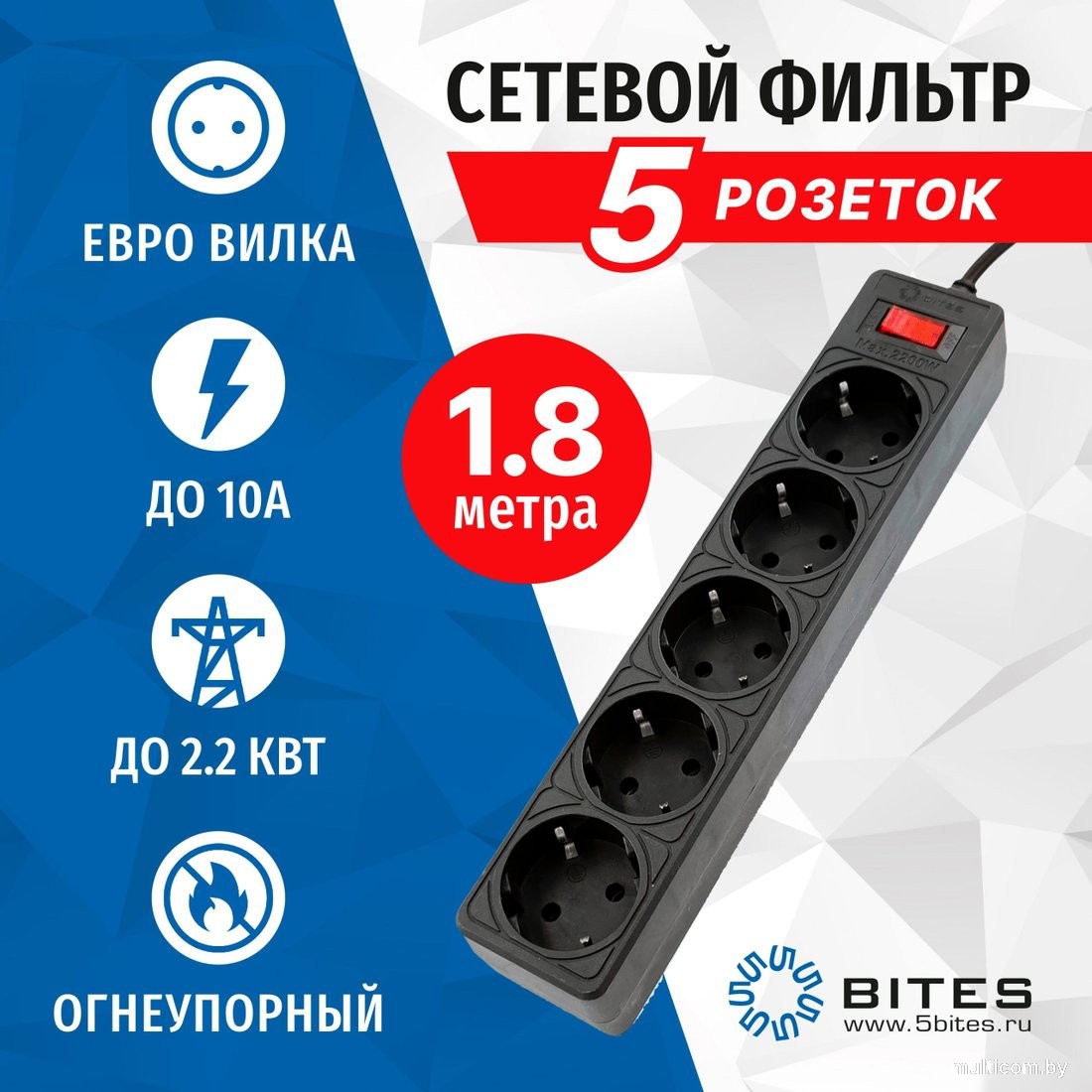 | Информация | Сетевой фильтр 5bites — отличное решение для подключения и защиты большинства видов офисной, компьютерной и бытовой техники (включая чайники и электрообогреватели). Защищает Вашу электронную технику от импульсных помех. Противоударный корпус сетевого фильтра выполнен из огнеупорного пластика, а силовые контакты — из меди, что особенно важно при многократном подключении периферии с евро-вилкой (с заземлением). Подходит как для подключения евро-вилок с заземлением, так и советских (тип С). Адаптирован для российских электросетей. |