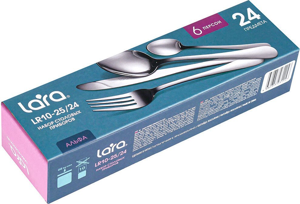 | Информация | Столовые приборы LARA LR10-25/24 Альфа – это превосходный набор высокого качества, включающий 24 предмета на 6 персон. Каждый предмет идеально сбалансирован, ручки имеют специальную форму и отлично лежат в руке. Комплект изготовлен из пищевой нержавеющей стали, не имеет запаха и сохраняет вкус и аромат продуктов. Все изделия высокого качества и очень прочные, не гнутся, имеют длительный срок службы, отлично сохраняют эксплуатационные свойства. Столовые приборы Lara подходят как для ежедневного использования, так и для сервировки праздничного стола. Можно мыть в посудомоечной машине. |