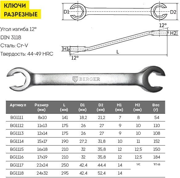 | Информация | - Ключ из прочной и качественной хром-ванадиевой стали, с антикоррозийным покрытием «Сатин». - Рабочая поверхность разрезного ключа имеет изогнутый под углом 15 градусов накидной шестигранный захват с прорезью с обеих сторон. - Двухсторонняя маркировка ключа облегчает идентификацию. |