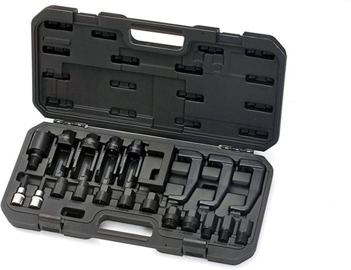 | Информация | Быстрое и безопасное снятие дизельных форсунок Bosch, Delphi, Denso и Siemens. Область применения: Станции технического обслуживания (СТО), автосервисы, автомастерские. Комплектация: 1 шт. - универсальный поворотный адаптер: M18х1,5; 2 шт. - головки с шестигранными вставками 10 мм, с отвертиями 7.6 и 6.6 мм; 10 шт. - резьбовые адаптеры: М14x1.5, М16x1.0, М17x1.0, М20x1.0, М25x1.0, М27x1.0; 4 шт. - головки разрезные: 25, 27, 29, 30 мм; 4 шт. - съёмники форсунок: 12 / 13,5 / 16 / 26 мм.  |