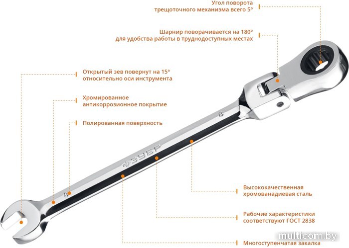 | Информация | Профессиональные ключи — изготавливаются из хромованадиевой стали методом ковки и последующей холодной штамповки, закалены, имеют стойкое хромированное покрытие. Проходят прецизионную механическую обработку, благодаря чему достигаются максимальные ресурс и геометрическая точность. Соответствуют ГОСТу и стандарту DIN. Наилучший выбор для промышленного применения. Ключи изготовлены из высококачественной хромованадиевой стали с многоступенчатой закалкой для увеличения ресурса ключей, а также обладают надежным хромированным покрытием для защиты от коррозии. Рожковым зевом можно работать с крепежом, даже когда доступ к нему открыт только с одной стороны и нет возможности накинуть ключ на крепежный элемент. Зев расположен под углом 15 градусов к оси рукоятки, для работ в труднодоступных местах. При работе трещоточным ключом угол поворота составляет всего 5 градусов, что позволяет работать в труднодоступных местах без необходимости перезахвата крепежа. |