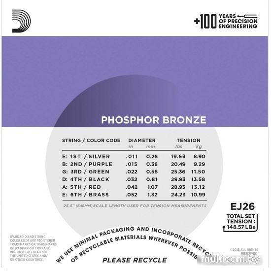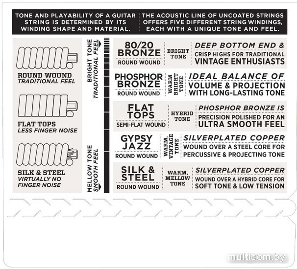 | Информация | Калибр струн — .011, .015, .022, .032, .042, .052. Такой комплект подойдет гитаристам, которые хотят иметь более глубокое звучание нижних струн и меньшее натяжение, большую открытость и гибкость верхних струн. Гексагональный сердечник (форма в виде шестиугольника, которая обеспечивает более плотный контакт обмотки со струной и улучшает звучание) струн сделан из высокоуглеродистой стали, а нижние четыре струны имеют обмотку из фосфорной бронзы — сплава, представленного компанией в 1974 году. Такие струны имеют сбалансированное звучание, одновременно яркое и теплое. Комплект изготовлен в США и поставляется в экологичной упаковке, защищающей струны от коррозии. |