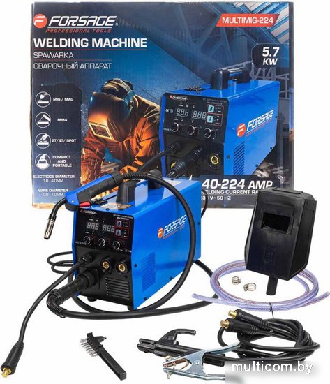 | Комплект поставки | - Сварочный аппарат - 1 шт. - Сварочная маска - 1 шт. - Щётка сварщика - 1 шт. - Кабель с клеммой - 1 шт. - Кабель с держателем электрода - 1 шт. - Рукав с рукояткой для полуавтоматической сварки - 1 шт. |