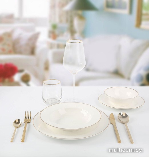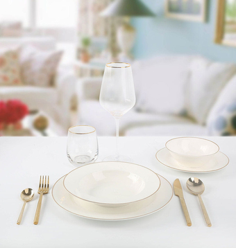 | Информация | Набор столовой посуды Arya модель Dory Gold из коллекции Exclusive, состоящий из 24 предметов. Посуда изготовлена из костяного фарфора. Основной цвет белый с золотистой окантовкой. |