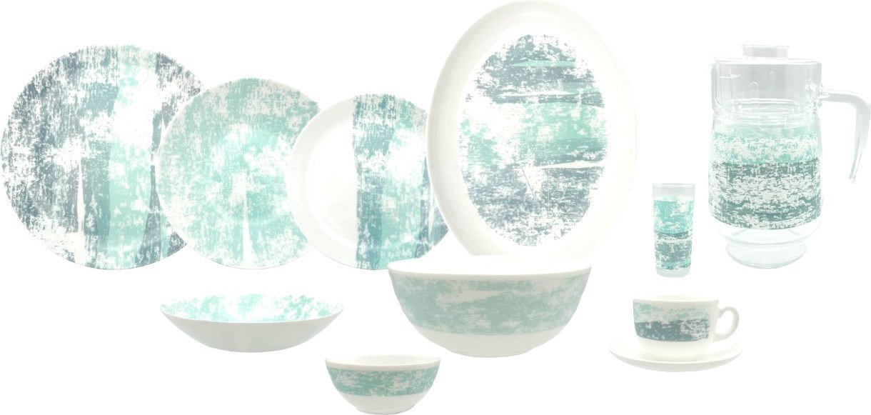 | Состав набора | тарелка столовая обеденная (6 шт.), тарелка закусочная (десертная) (6 шт.), тарелка столовая глубокая (6 шт.), салатник (7 шт.), блюдо (1 шт.), блюдце (6 шт.), чашка (6 шт.), стакан (6 шт.), графин (1 шт.) |