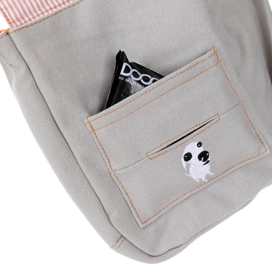 ИнформацияСумка для ношения на плече – идеальный аксессуар для прогулки с собакой, сумка имеет стильный полосатый ремень и полосатую внутреннюю отделку из хлопка с защитным карманом для телефона. Сетчатый карман сбоку предназначен для бутылки с водой или игрушки, предусмотрено отдельное местечко для хранения гигиенических биоразлагаемых пакетов.