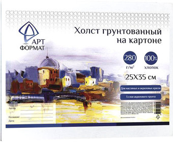 | Информация | Ассортимент художественных товаров «АРТформат» пополнился линией грунтованных художественных холстов на картоне. Холсты на картоне предназначены для живописи масляными и акриловыми красками и являются одним из самых базовых расходных материалов в живописи. Этот товар особенно востребован у тех, кто учится рисованию самостоятельно или в художественных школах и вузах. - Линия включает 6 самых популярных размеров- Состав холста – 100% хлопок- Покрытие – 3 слоя универсального акрилового белого грунта- Плотность холста – 280 г/м?- Фактура – мелкое зерно- Картон плотностью 3 мм. Художественные товары АРТформат ориентированы на новичков в живописи и разрабатываются с учетом потребности таких покупателей в большом количестве качественных и при этом недорогих расходных материалов для обучения и оттачивания мастерства. |