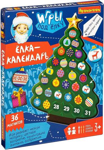 | Информация | Ёлка-календарь - это многослойная магнитная игра, имеющая два игровых варианта. Магнитная доска в наборе выполнена в виде ёлки. В преддверии нового года, наряди свою ёлку разноцветными красочными магнитами-шарами, добавь звезду-наконечник. Или используй ёлку как адвент-календарь, в течение всего декабря последовательно заполняя круги с датами на ёлке магнитами с елочными шарами. |