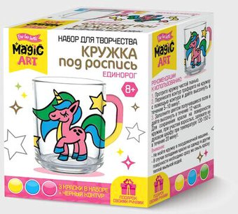 | Информация | Кружка под роспись «Единорог» обязательно увлечёт вашего ребёнка яркими цветами и оригинальным исполнением! Используя шаблон, Вы сможете сделать неповторимую композицию на стеклянной поверхности и дополнить ей ваш интерьер. Кроме того, необычно оформленная кружка может стать великолепным подарком близким и друзьям. Состав набора: • стеклянная кружка – 1 шт (высота 9 см, диаметр 7 см) • акриловые краски – 3 шт (жёлтая, розовая, голубая) • акриловый контур – 1 шт • рисунок-трафарет – 1 шт (16 х 7,5 см) • кисточка – 1 шт (13,5 см) Набор предназначен для детей от 8 лет. Как играть? 1. Протрите кружку чистой тканью. 2. Перенесите контуры трафарета на кружку с помощью акрилового контура и дайте высохнуть в течение 5-10 минут. 3. Заполните цветом получившиеся поля и дайте высохнуть в течение 12 часов. 4. Для сохранения краски на поверхности кружки, при участии взрослых запеките ее в духовом шкафу при температуре 120-150 °С в течение 20 минут. Внимание! Не мойте кружку в посудомоечной машине. В случае попадания краски на одежду и другие поверхности необходимо сразу смыть краску теплой мыльной водой. Не подвергать механическому воздействию. Не использовать в качестве посуды! Избегать контактов с пищевыми продуктами Кружка под роспись «Единорог» помогает развитию творческих способностей ребёнка, мелкой моторики, а также способствует концентрации внимания и художественного вкуса. Больше готовых и развивающих наборов для творчества смотрите в разделе «Наборы для творчества». |