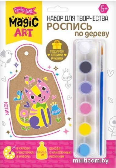 | Информация | Набор роспись по дереву «Котик» развивает творческие способности, образное мышление, фантазию, чувство цвета и мелкую моторику. Для росписи используйте как чистые цвета — из баночек, так и смесевые, полученные при смешивании двух или трех разных красок. Смешивайте краски на палитре или листе бумаги. Начинать роспись лучше со светлых тонов, а заканчивать темными. Необходимо тщательно мыть кисточку при переходе от одного цвета к другому. Не оставляйте баночки надолго открытыми, чтобы краски не высыхали. Расписывать доску можно так, как показано на упаковке, а можно по-своему, руководствуясь собственной фантазией. |