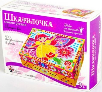 | Информация | В набор для творчества "Шкатулка" входит все необходимое для того, чтобы украсить небольшую коробочку изображением милой феи, составленным из страз. Помимо самой шкатулки в набор входят 400 страз восьми разных цветов, из которых и собирается итоговое изображение. Стразы в наборе сделаны из качественного пластика. |
