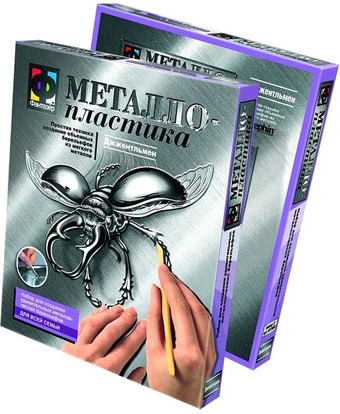 | Информация | Металлопластика - это древняя техника создания рельефных изображений, которая с давних времен используется для украшения мебели, изготовления различных элементов декора или в качестве самостоятельного произведения искусства. Рельефные изображение получают на тонких листах металла путем выдавливания контура рисунка специальным инструментом. Набор «Металлопластика» позволяет каждому желающему освоить технику, которой когда-то владели лишь искусные мастера. |
